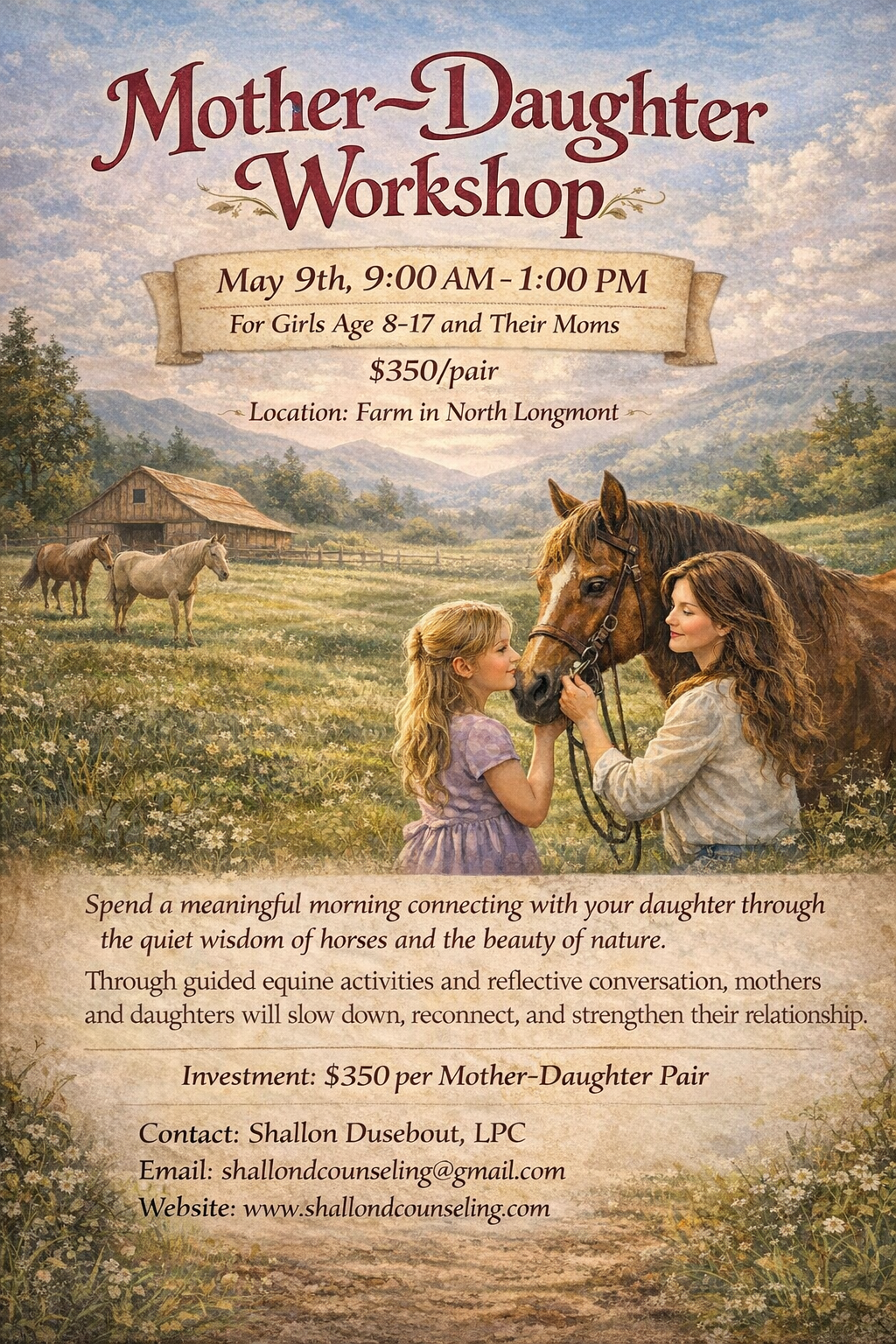 Come spend a meaningful morning connecting with your daughter through the quiet wisdom of horses and the beauty of nature. Through guided equine activities, reflective conversations, and shared experiences, mothers and daughters will explore trust, communication, and the unique bond they share. This workshop offers space to slow down, listen, and strengthen your relationship in a supportive and memorable way.